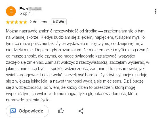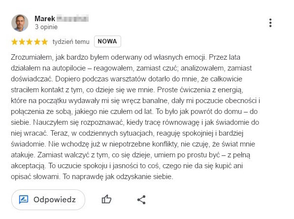Robimy proste ćwiczenia – ale najpierw dokładnie tłumaczę, co, po co i jak działa. Medytacja? Jeśli ma sens w danym momencie – zrobimy. Taniec? Też może być medytacją, ale nie. To nie ten klimat. Płacz? Jeśli coś poruszy – masz do tego pełne prawo. Tu nie trzeba nic tłumić ani udawać, że wszystko gra. To bezpieczna przestrzeń, gdzie możesz być sobą. Bez scen. Bez presji. Bez masek.